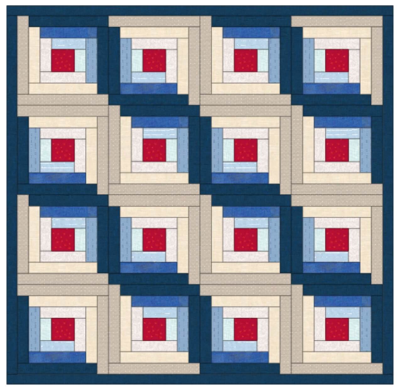 Der Log Cabin Quiltblock zählt zu den klassischen Patchwork Quilt Mustern. Traditionell wird eine Hälfte des Quilt Blocks hell und die andere Hälfte in dunkleren Farbtönen gehalten und symbolisieren Licht und Schatten oder Tag und Nacht in einem Blockhaus. Das rote Quadrat in der Mitte des Blocks steht für die Feuerstelle des Hauses, die für Wärme und Behaglichkeit sorgt.