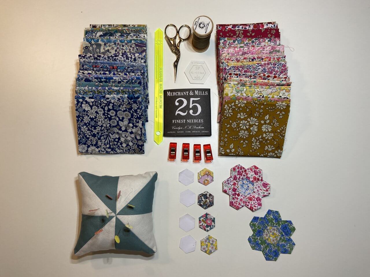 Man braucht nicht mehr als ein paar Stoffreste, Nadel und Faden, Papiervorlagen, Schere und Stoffklammer – schon kann’s losgehen. Wir nähen einen Grandmother´s Flower Garden Quiltblock, indem kleine Hexagon Schablonen aus Papier mit Stoffstücken überzogen und anschließend zu einer Blume zusammengenäht werden. Wir vernähen Liberty Baumwollstoff Batist Tana Lawn ® , ein wunderbar feinfädiger und seidenweicher Stoff, der sich ganz hervorragend für diese spezielle Nähtechnik eignet. Aus einer großen Auswahl an verschiedenen Prints darfst du dir deinen ganz persönlichen Lieblingsstoff aussuchen. Anschließend erlernen wir in einem weiteren Arbeitsschritt wie man den Quilt Block auf einem Geschirrtuch (100% Leinen) appliziert. Diese traditionelle Patchworktechnik wirkt herrlich entschleunigend, eignet sich besonders gut zur Verwertung kleiner Stoffreste und ist auch perfekt zum Mitnehmen für unterwegs. Nach dem Kurs nimmst Du nicht nur eine selbstgenähte Kostbarkeit mit nach Hause, du hast an diesem Kurstag eine Technik so gut erlernt, daß Du sie danach mit wenigen Zutaten reproduzieren kannst. Vielleicht überraschst du ja dieses Jahr zu Weihnachten Familie und Freunde mit etwas Selbstgenähtem?